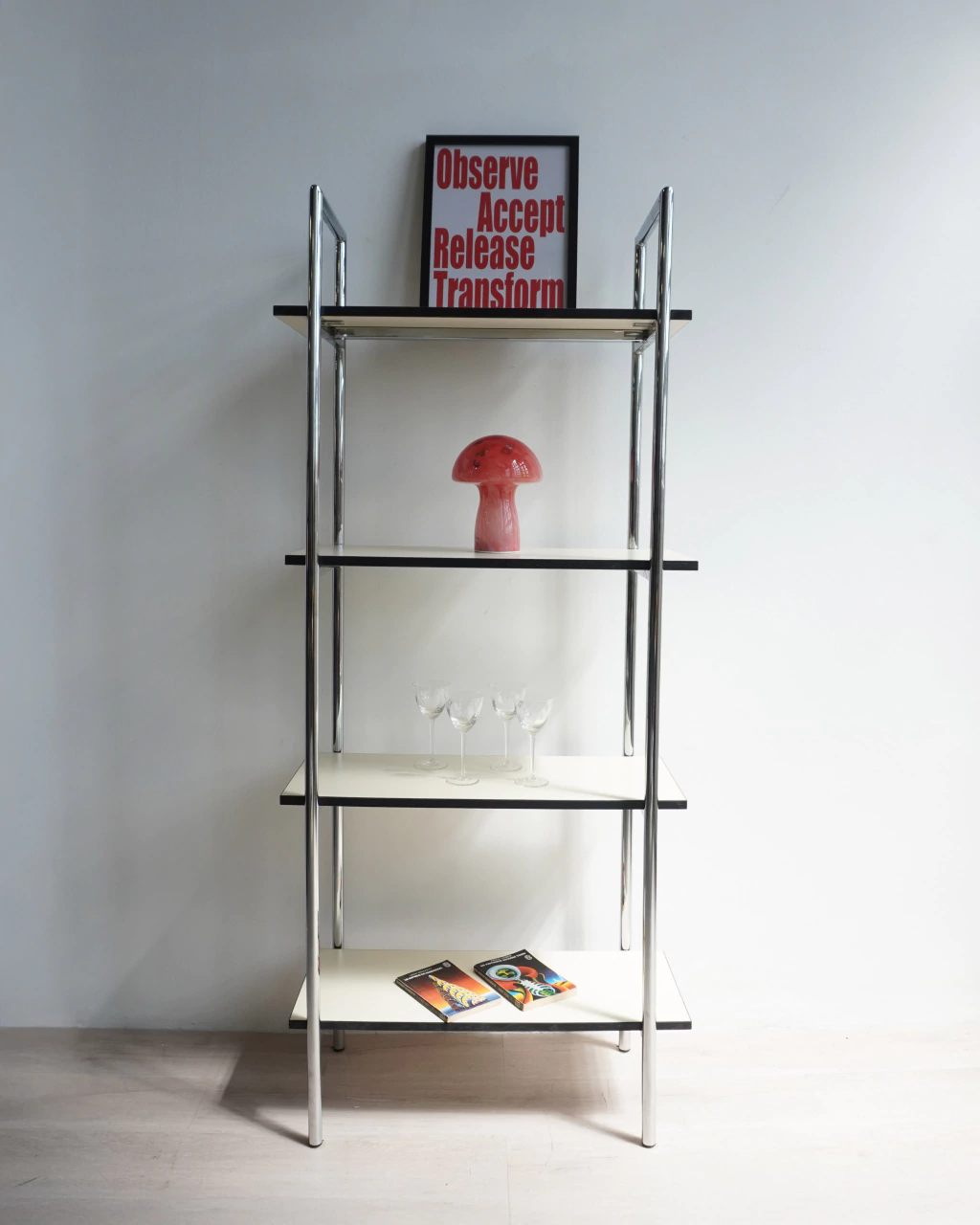 4 Estantes de melamina y estructura de caño cromada.