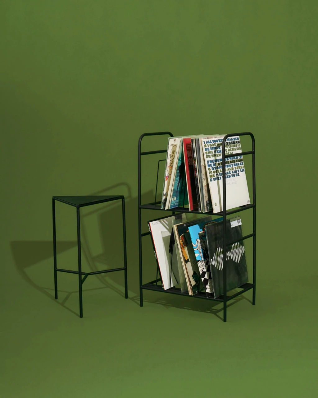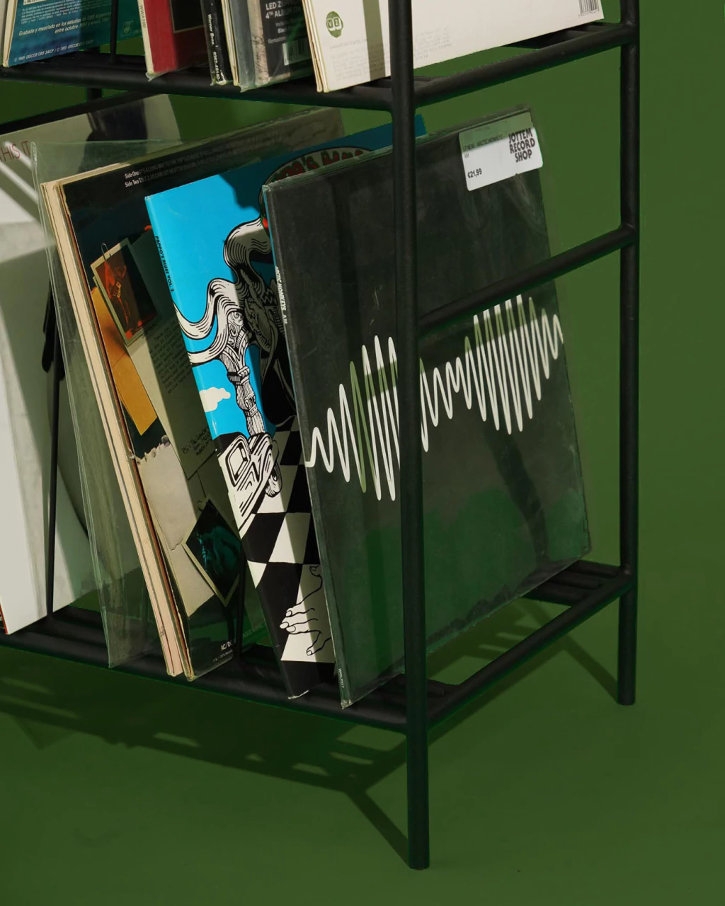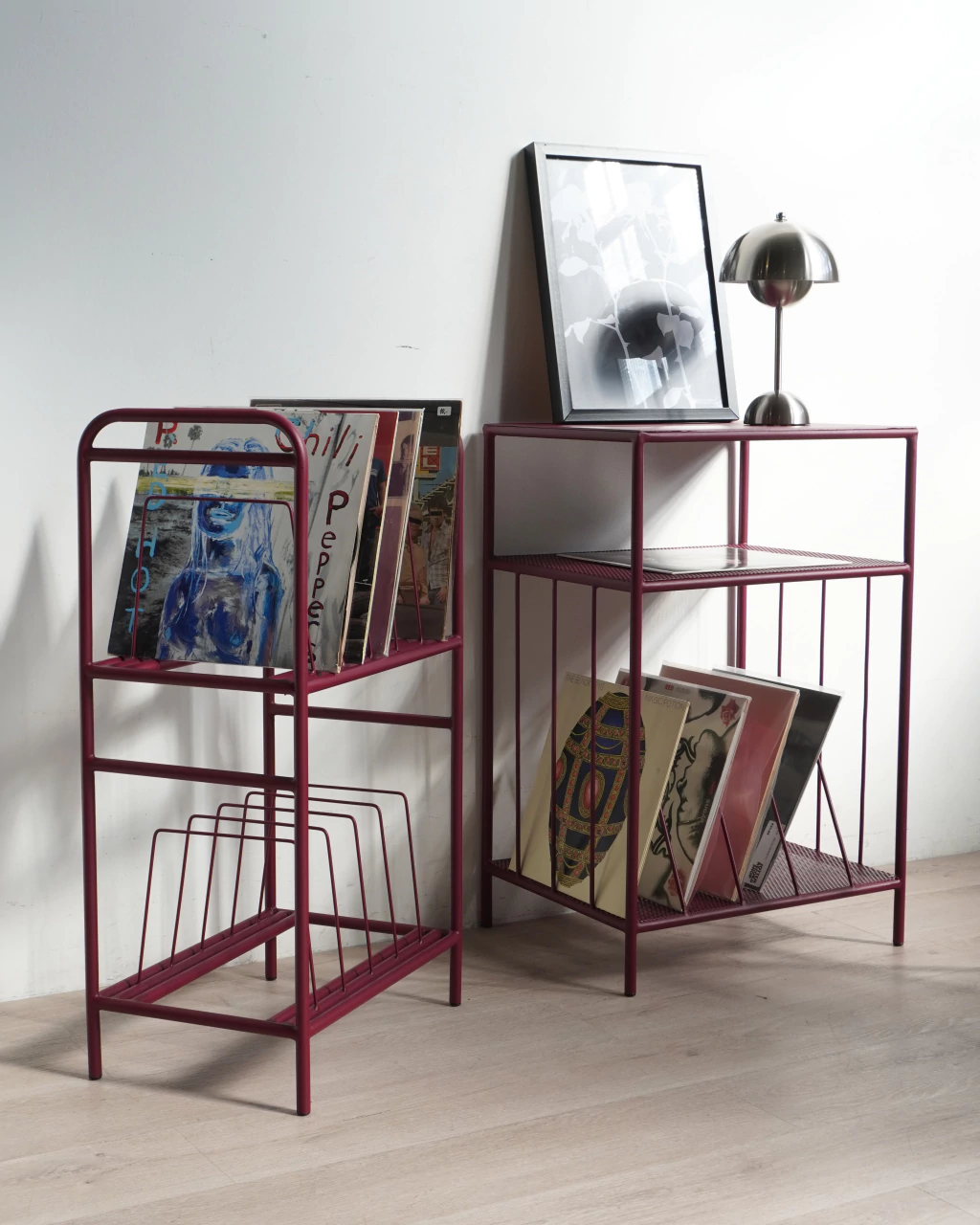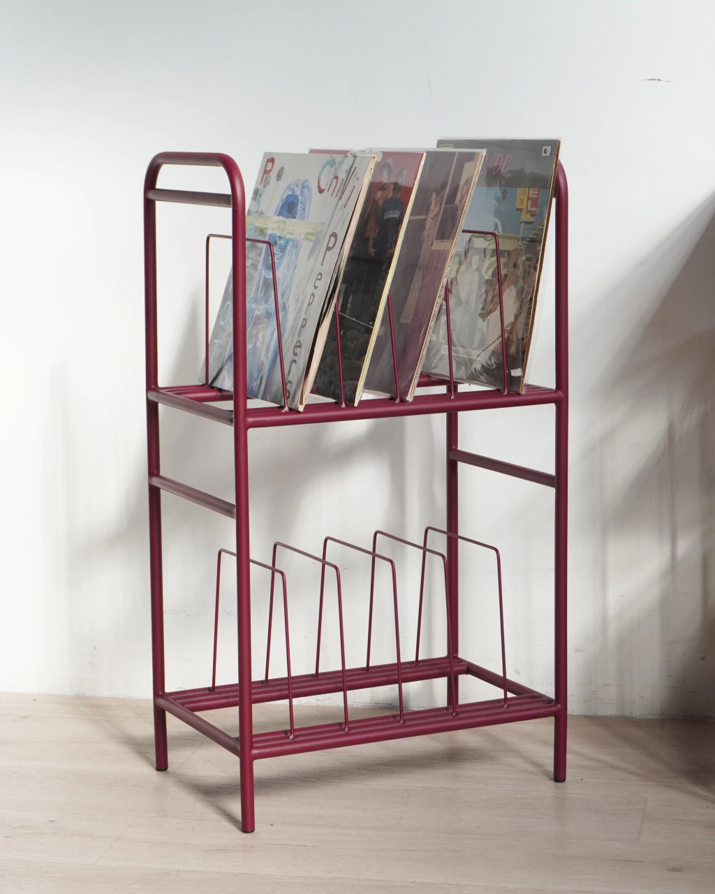 Mueble organizador de vinilos de caño y varilla de hierro.
